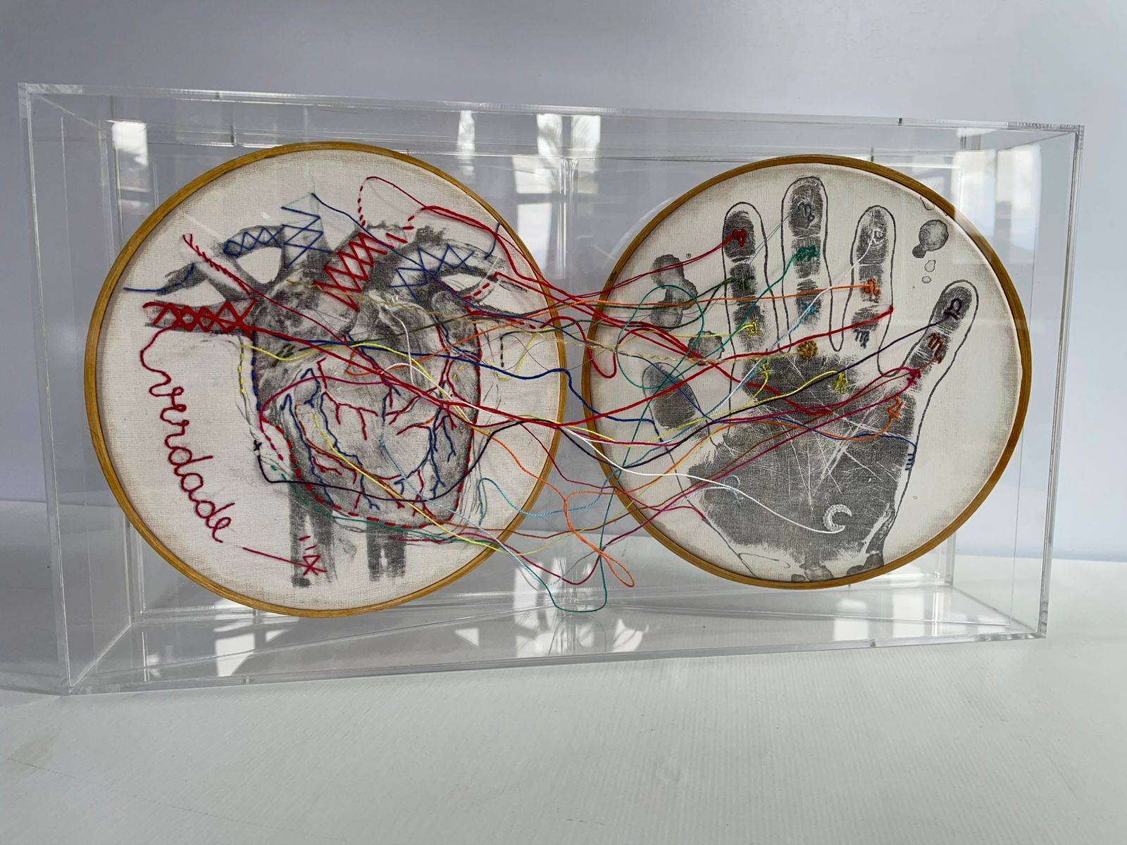 Litografias impressas em tecido de algodão, conectadas pelas linhas do bordado. Na mão, a quiromancia e os planetas, a linha da vida, do coração e do destino se prolongam nos vasos e ramos cardíacos, corpo e alma interligados. Tiragem de 2.