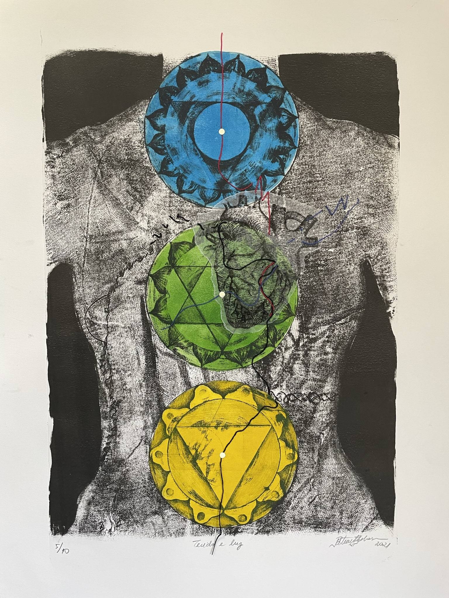 Gravura original impressa manualmente pela artista, numerada e catalogada, com certificado de autenticidade. Litografia com estêncil, bordado, colagem e tinta fosforescente impressa em papel Rives 250g, em tiragem de 10. Nesta gravura, três chakras estão alinhados com os pontos da acupuntura e o vaso concepção, um dos principais meridianos da medicina tradicional chinesa. Os pontos brilham no escuro para lembrar que somos feitos de luz.